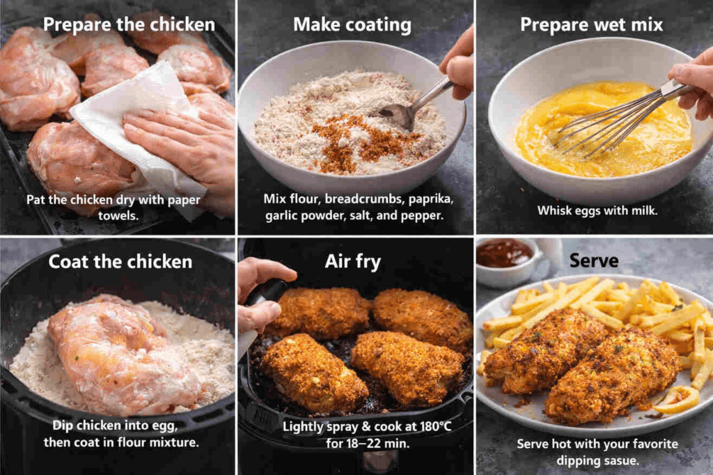 Dip chicken into the egg mixture, then coat well in the flour mixture. - Air fry