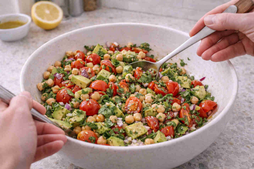 Add chickpeas to a large bowl. Gently fold in diced avocado, cherry tomatoes, red onion, and fresh herbs.