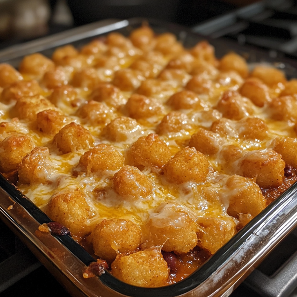 - Assemble the Casserole: Spread the chili evenly into a greased baking dish. Top with 1 cup of shredded cheese, then arrange tater tots in a single layer on top.