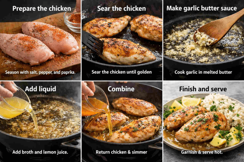 Heat olive oil in a skillet over medium heat. Cook chicken for 5–6 minutes per side until golden and cooked through. Remove and set aside. - Make garlic butter sauce