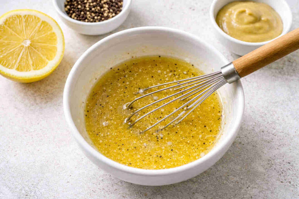 - In a small bowl, whisk together olive oil, lemon juice, Dijon mustard, salt, and pepper.