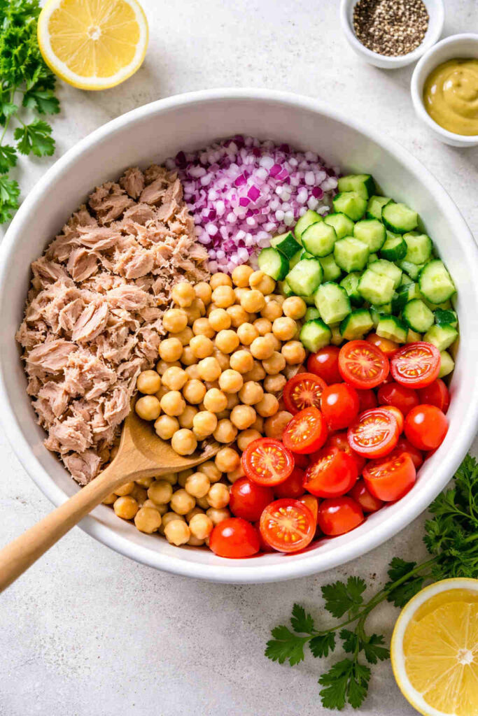 - In a large bowl, combine tuna, chickpeas, red onion, cucumber, and cherry tomatoes.