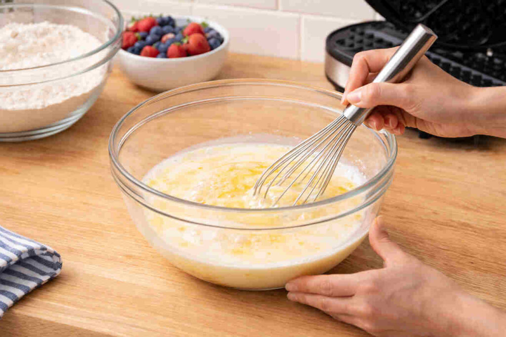 - In a separate bowl, whisk the eggs, then add the milk, melted butter, and vanilla extract.