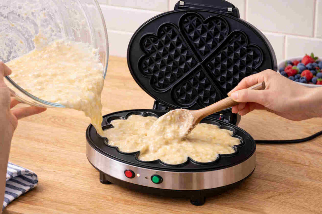 - Pour the batter into the preheated waffle iron, spreading it gently to fill the heart shape. Close the lid and cook until the waffles are golden brown and crisp.