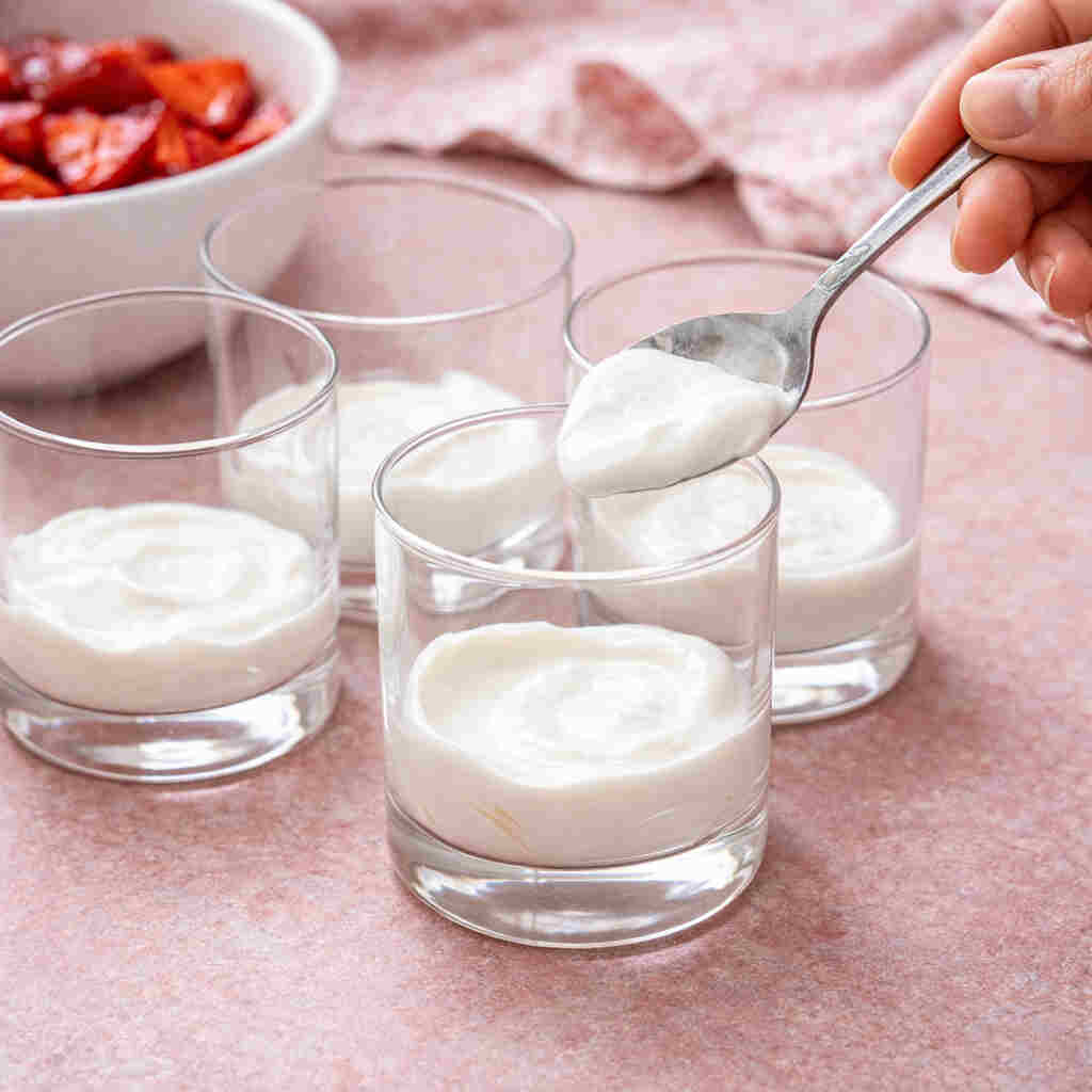 Spoon a layer of yogurt into the bottom of each serving glass or jar. Smooth it out slightly so the layers look clean.
