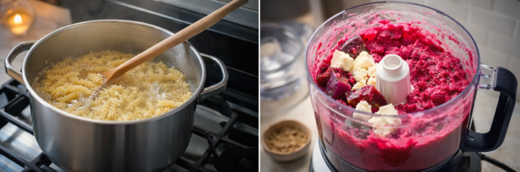 Begin by boiling your pasta in a generous amount of salted water until al dente, following the package instructions. As the pasta cooks, prepare the unforgettable pink sauce: combine most of the feta (reserve a small amount for topping), beetroot, cream cheese, garlic, lemon juice, salt, and olive oil in a food processor or blender. Blitz thoroughly until the mix is silky smooth and vibrantly colored.