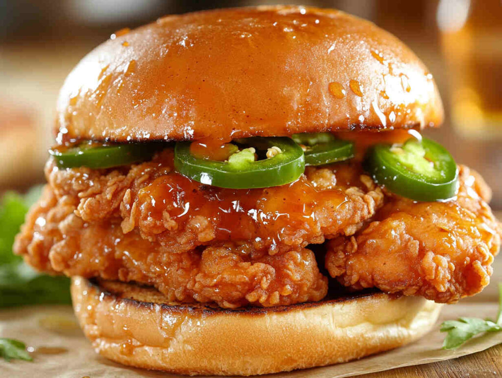 This is not your typical fried chicken sandwich. Each bite has a satisfying crunch, a wave of heat from jalapeños, and a sticky-sweet glaze that ties everything together. The spicy-sweet contrast is unforgettable. It’s perfect for indulgent weekends, backyard barbecues, or whenever you want a restaurant-quality sandwich at home.