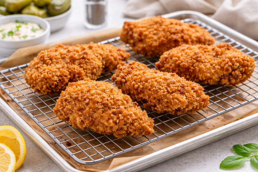 - Fry to Perfection: Heat oil to 350°F (175°C) and fry chicken for 6–8 minutes per side until golden brown and crispy. Drain on a wire rack.