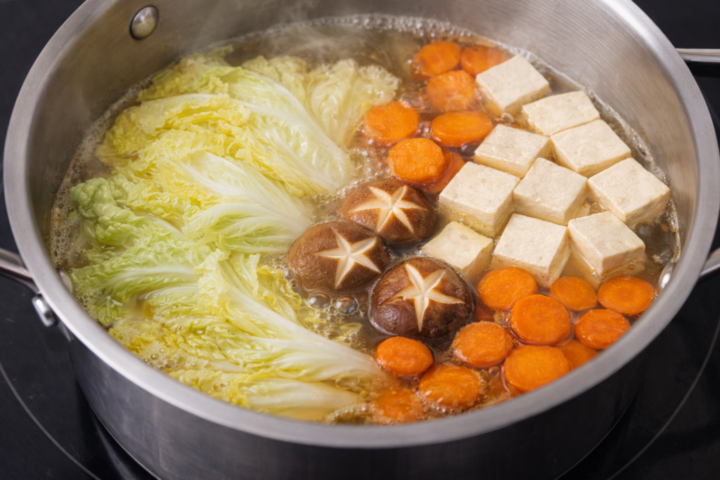 Cook the vegetables first Add the napa cabbage, carrots, mushrooms, and tofu to the simmering broth. Let them cook for 2–3 minutes until they begin to soften.