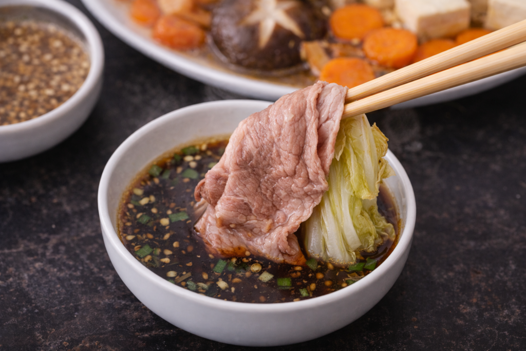 Dip and enjoy Remove the cooked beef and vegetables from the broth and dip them into ponzu or sesame sauce before eating.