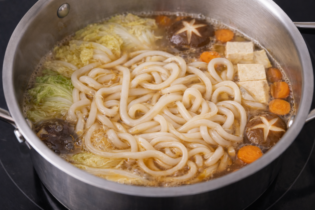 Add noodles at the end Once most of the ingredients are cooked, add udon noodles to the broth and cook them for a few minutes. The noodles absorb the flavorful broth and make a perfect finishing touch.