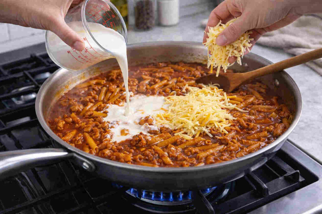 Stir in the heavy cream and shredded cheese until melted and smooth.