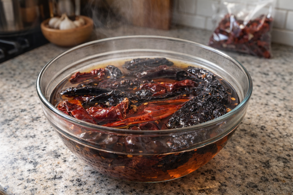 Place the dried guajillo and ancho chiles in a bowl and cover them with hot water. Let them soak for about 10 minutes until softened.