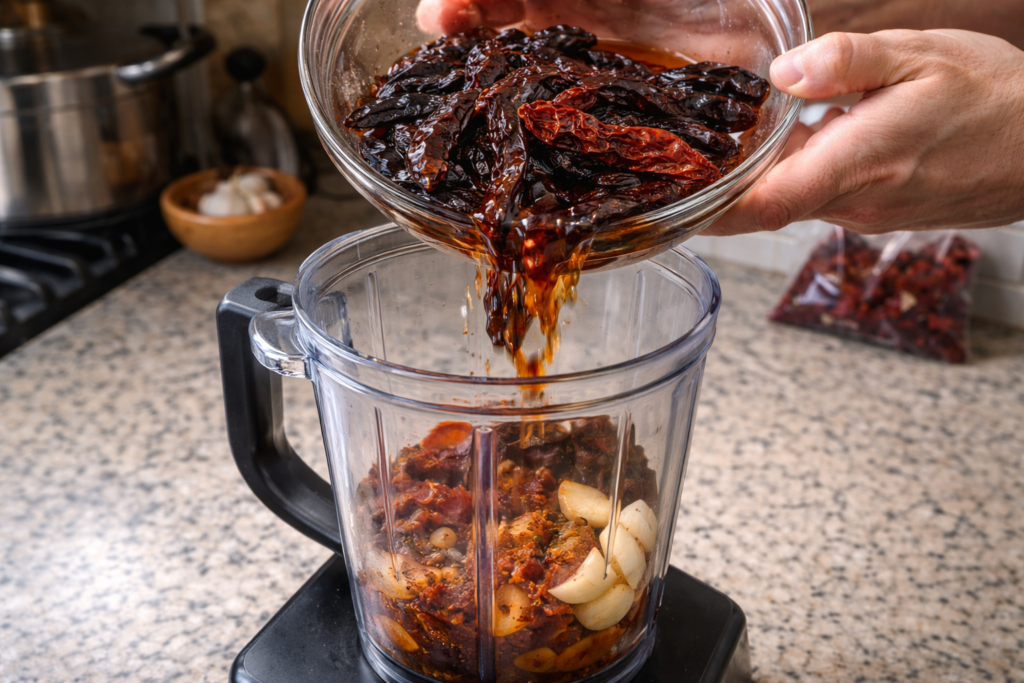 Transfer the softened chiles to a blender. Add beef broth, onion, garlic, vinegar, tomato paste, cumin, oregano, smoked paprika, cinnamon, and cloves. Blend until completely smooth.