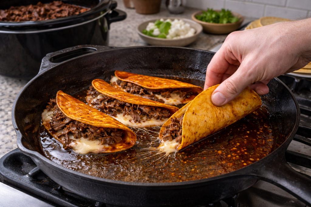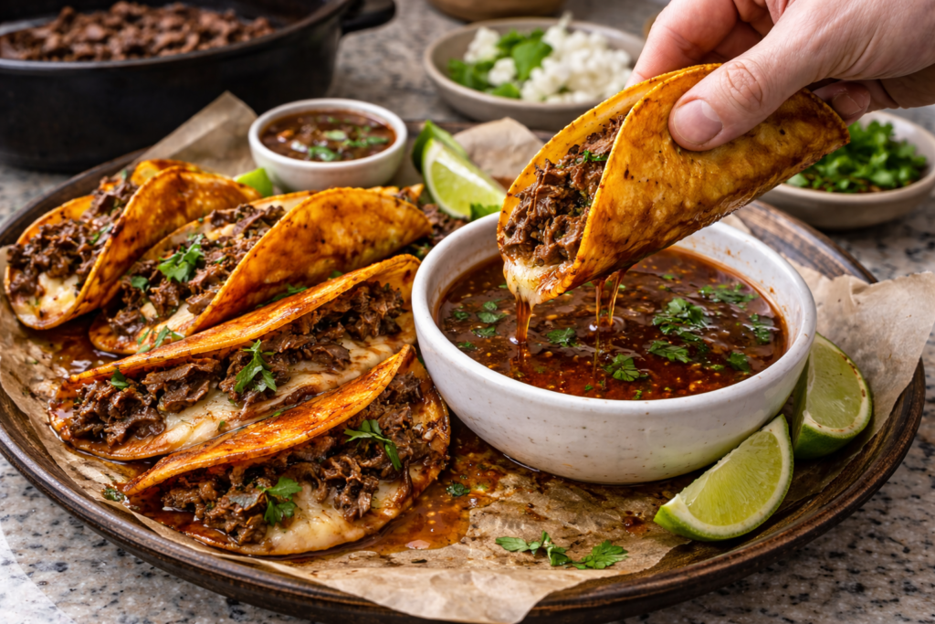 Dip the corn tortillas into the birria broth before placing them in a hot skillet. Add cheese and shredded beef, fold them, and cook until the tortillas become crispy and golden.