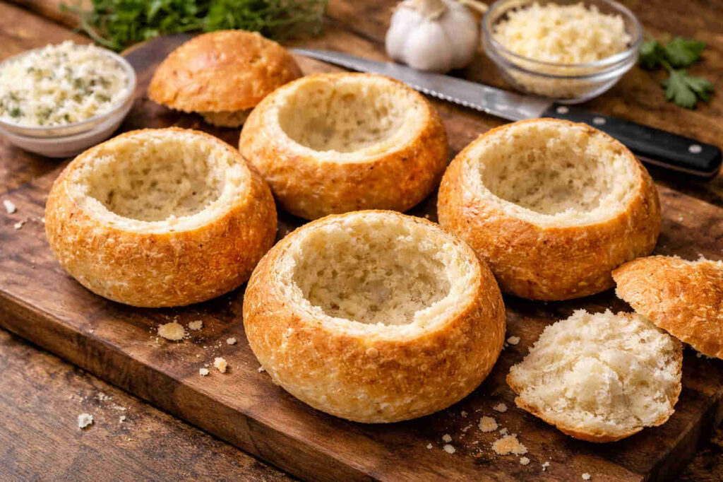 - Mix melted butter with minced garlic and parsley, then brush generously over the inside of each bread bowl.