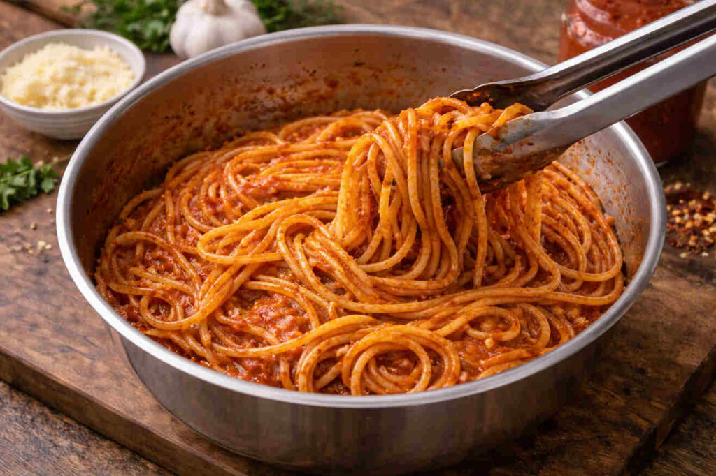 - Meanwhile, toss cooked spaghetti with marinara sauce until well coated.
