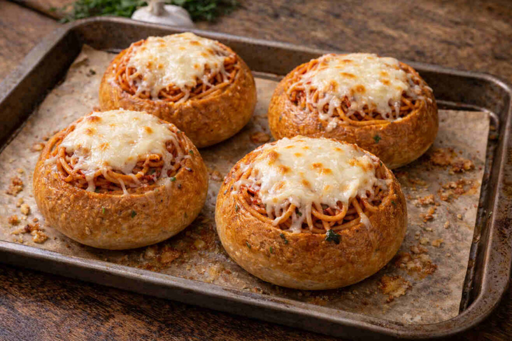This dish is a game-changer because it merges the buttery, garlicky crunch of toasted bread with saucy spaghetti in one cohesive bite. Instead of serving pasta on a plate, you tuck it neatly into hollowed-out garlic bread rolls, creating a portable, mess-free meal. It’s comfort food reimagined.