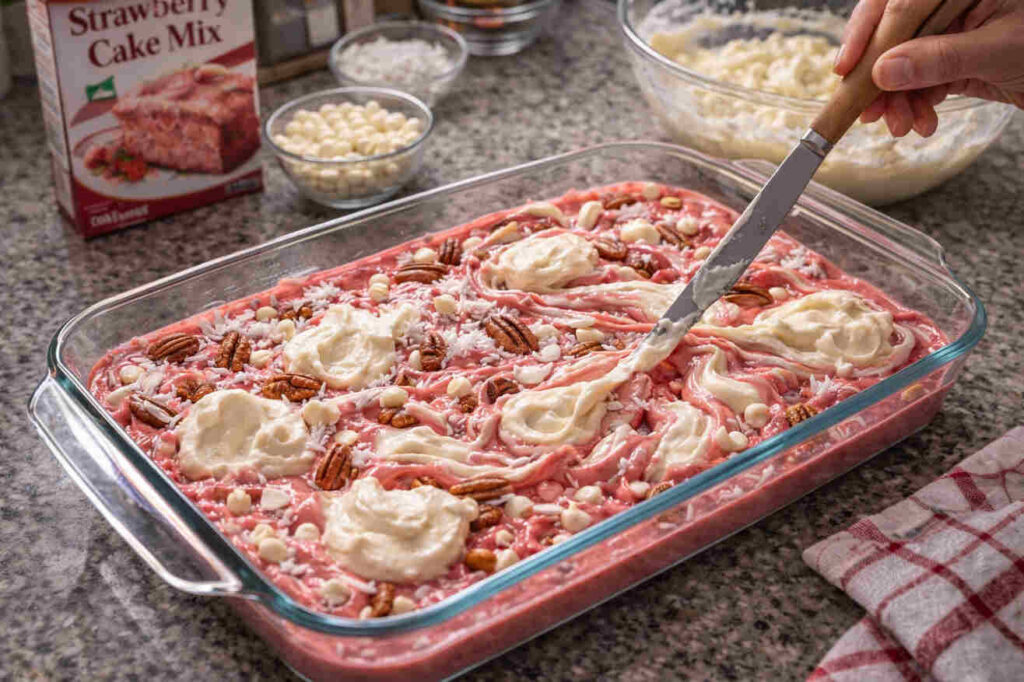 Mix the strawberry cake batter according to the box directions. Pour the batter evenly into the prepared baking dish.