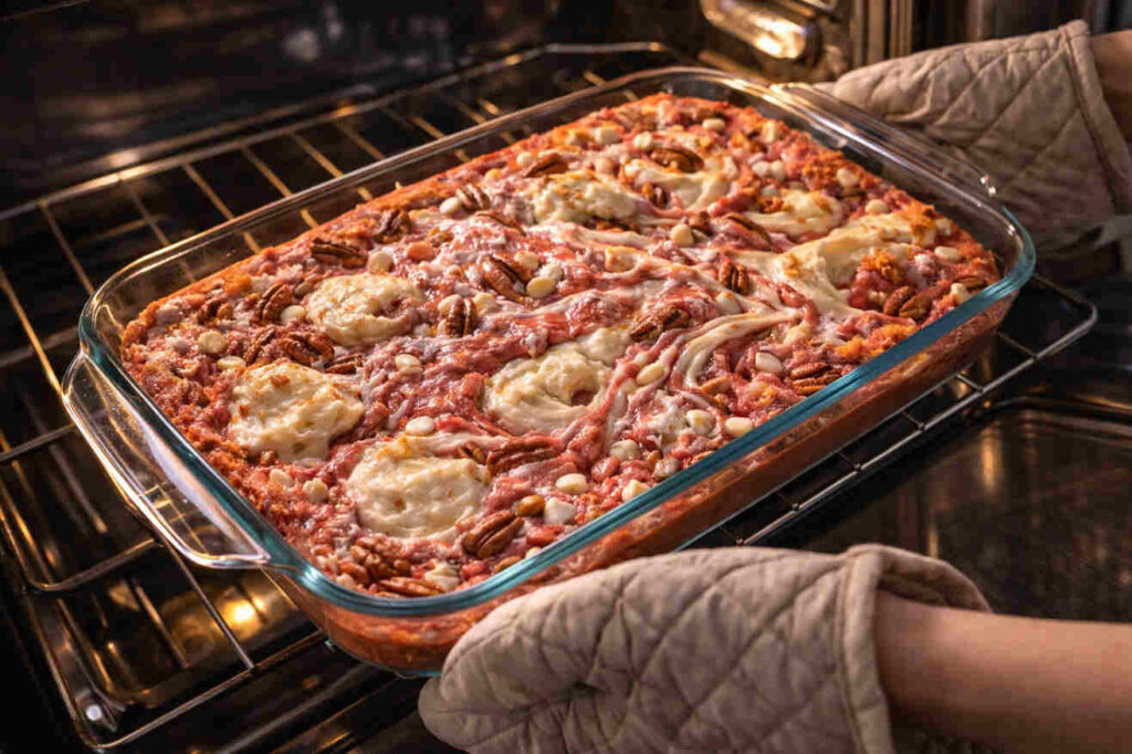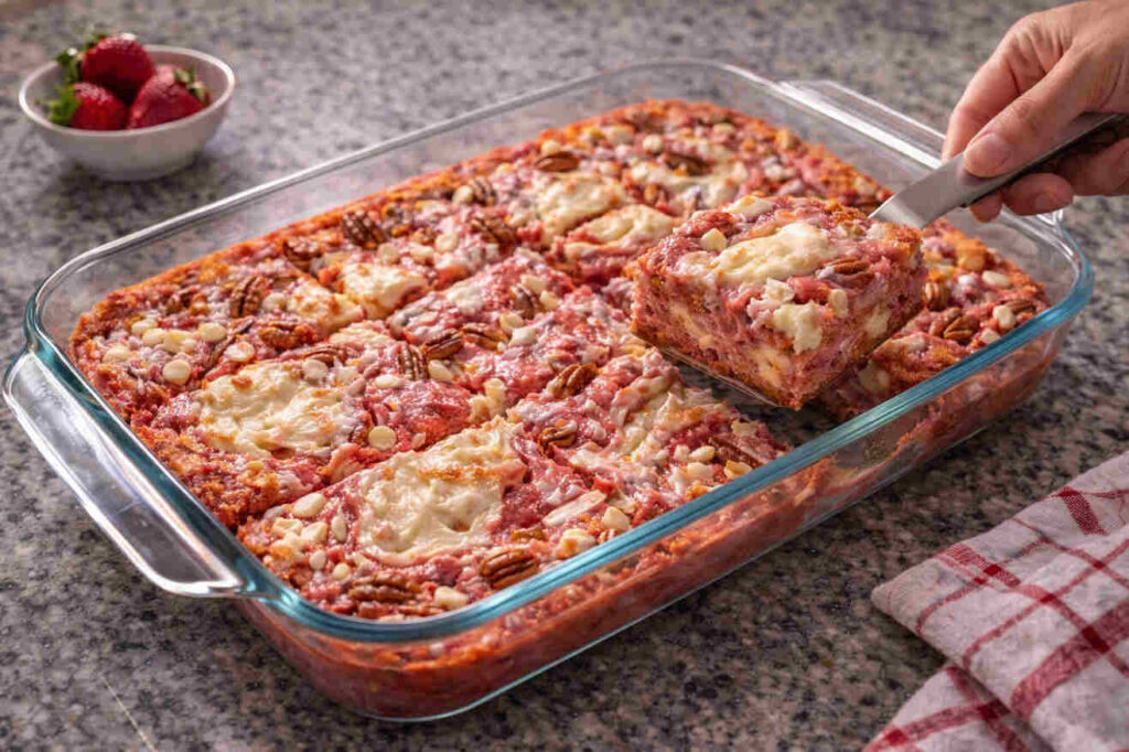 Every slice is different. Certain bites are rich and oozy with cream cheese, while others are fluffy strawberry cake with melted white chocolate and coconut. It’s the kind of traditional, popular dessert that disappears fast at potlucks, birthday parties, and family gatherings.