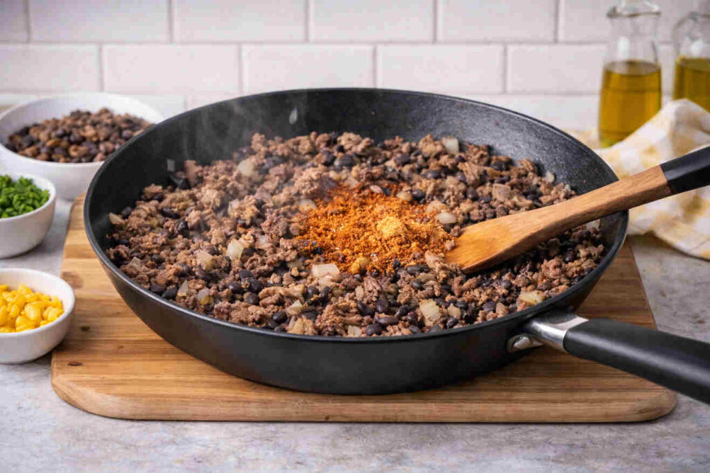 - In a large skillet, cook the ground beef and chopped onion, breaking it up as it browns. Add taco seasoning and stir until well combined. Turn off heat when cooked through.