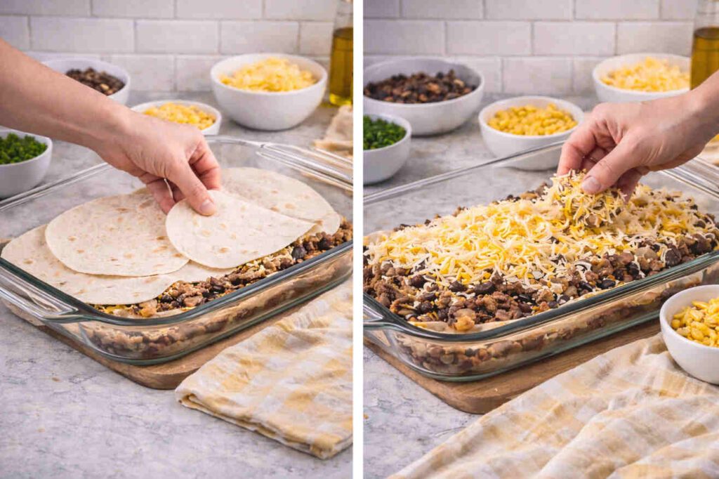 - Repeat with another layer of tortillas, then the remaining beef, beans, and another 1/3 of the cheese. Add optional green chilies or black beans for more flavor and texture.