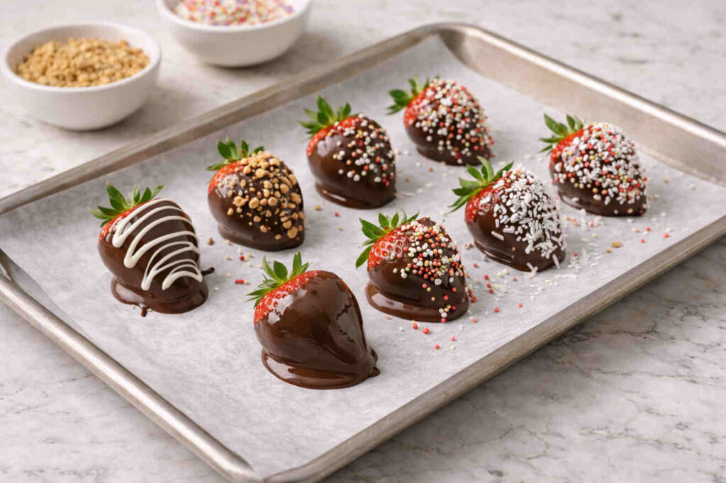 Place the dipped strawberries on the prepared baking sheet. Sprinkle toppings on the chocolate while it is still wet.