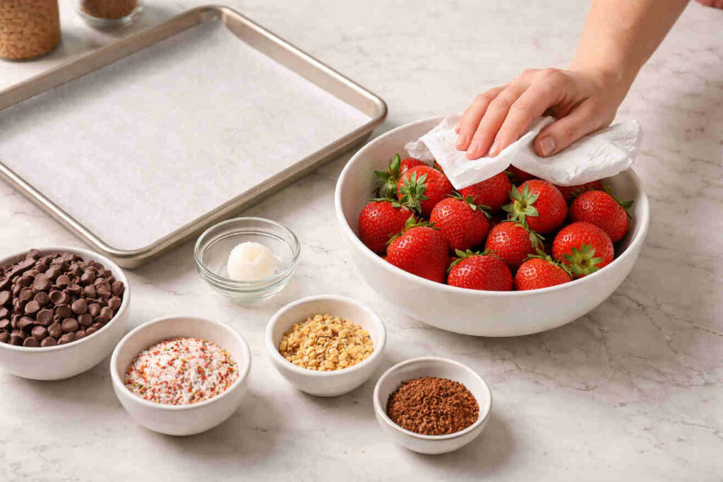 Gather all the ingredients. Line a baking sheet with parchment paper and gently wash the strawberries. Pat completely dry; any water will keep the chocolate from sticking.